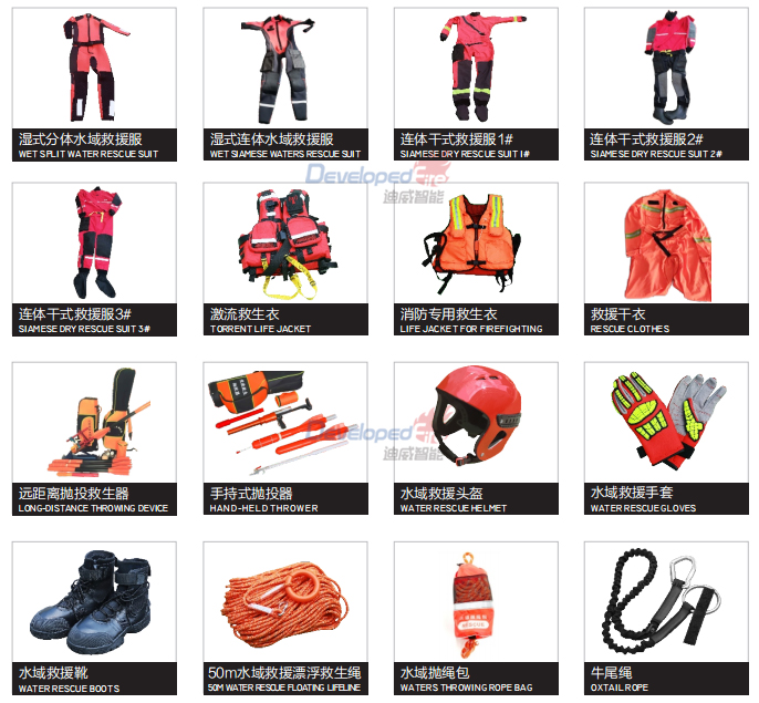 水域救援个人防护包含湿式水域救援服、激流 救⽣⾐、消防专用救⽣⾐、远距离抛投救⽣器、抛 投救援绳、救援通讯设备等装备,保证在多种⽔⾯环境情况下的消防救援⼈员⾃⾝安全和快速解救被困⼈员,为应急救援作业提供了便利。