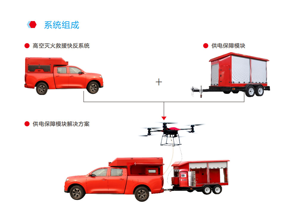 供电保障模块作为独立的拖挂单元系统,可配套我司的高空灭火救援快反系统或多种型号的消防车/皮卡车组成供电保障模块解决方案,实现应急救援中持续8小时不间供电,延长消防无人机高空作业时间;同时该方案还可以通信中继、应急照明等救援功能,为抢险救灾提供供电和通信保障。